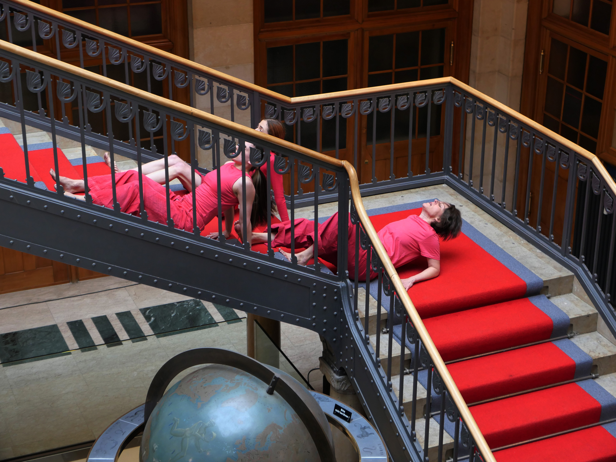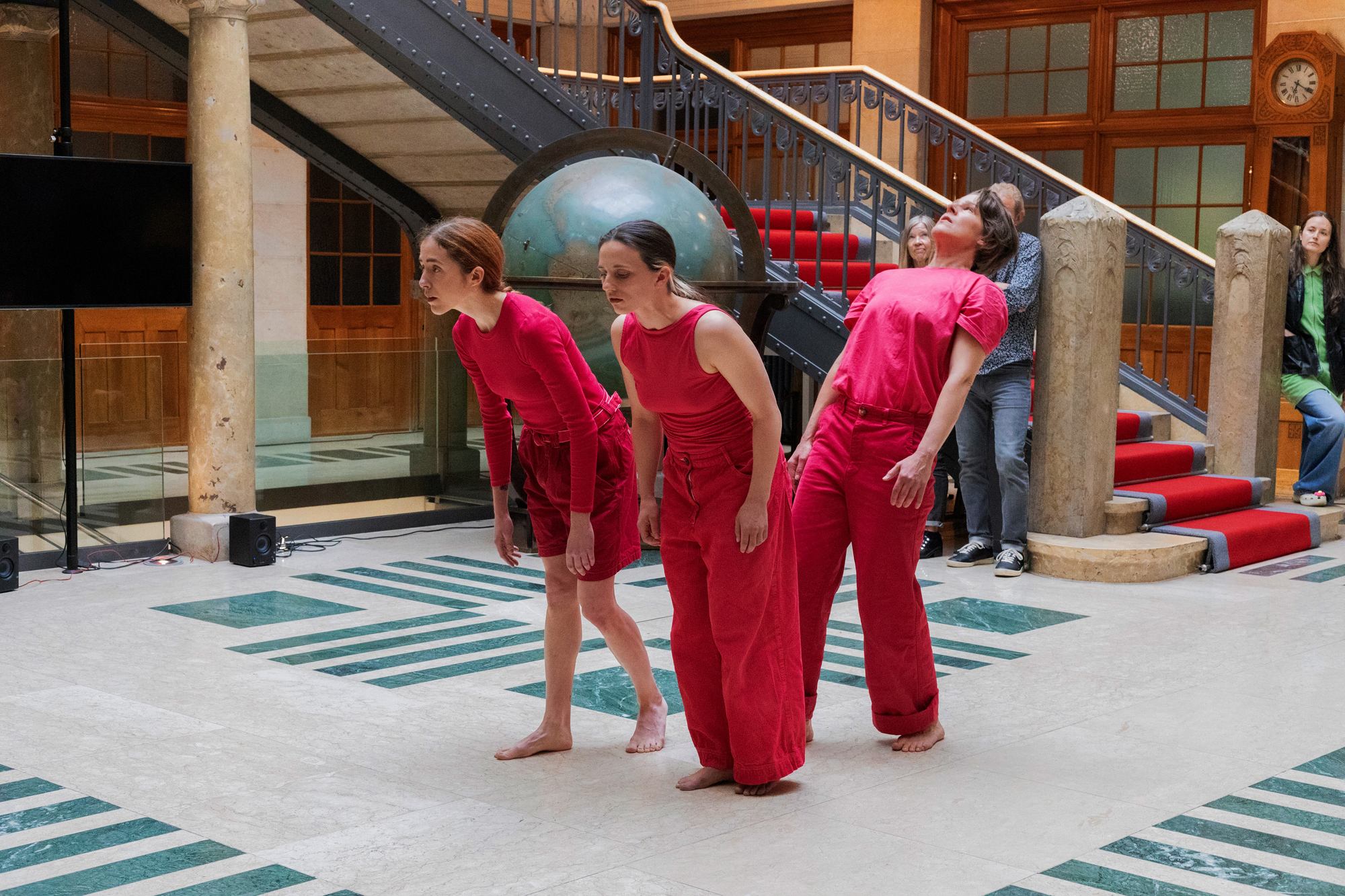 Stefanie Knobel developed a new live performance entitled The House for her exhibition On Surfaces and Structures at the Volkarthaus. She showed this on Saturday 24 May together with Charlotte Mathiessen and Nina Richard in the prestigious atrium of the Volkarthaus. The former company headquarters of the Volkart brothers, the place from which the lucrative global business with raw cotton was controlled, is confronted with gestures of resistance and rebellion. Space is taken up, conditions are reversed. Through repetitive movement sequences based on Stefanie's practice of listening with the hyoid bone and arising from her collaboration with former textile workers, more-than-human relations open up, destabilising the fixed order and addressing what is concealed. Accompanied by a sound carpet consisting of the noises of automatic spinning machines interwoven with the sounds of river dolphins, the choreographed movements formulate a silent scream, a loud absence.