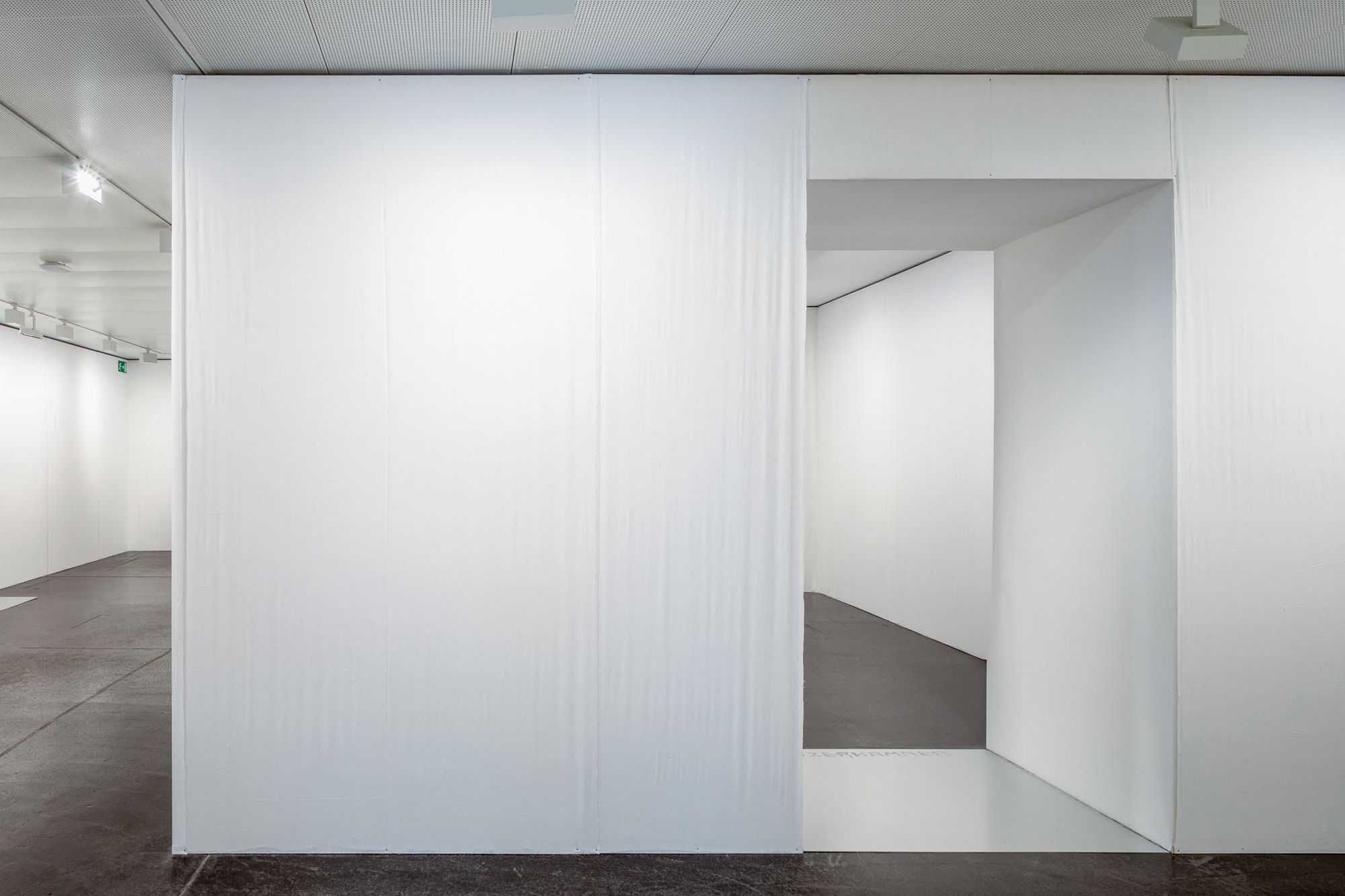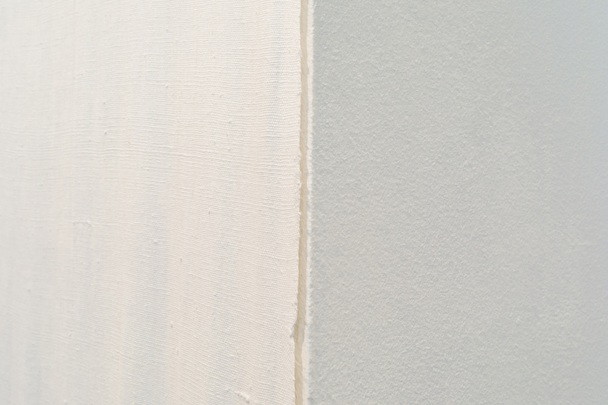 In the basement of the Volkarthaus, the artist has covered all the white walls of the exhibition space with cotton fabric. The fabric is a hand-woven, bleached khadi cotton produced by Chandrakanta Lalitmohan in Islampur, in the Murshidabad district of the Indian state of West Bengal, which the artist had shipped to Winterthur. Khadi has its historical roots in the civil disobedience movement against British colonial rule, which boycotted cheap cotton products from Great Britain and at the same time promoted local textile production, which had been destroyed under British rule. The wall covering reflects the White Cube as a supposedly neutral exhibition space.
