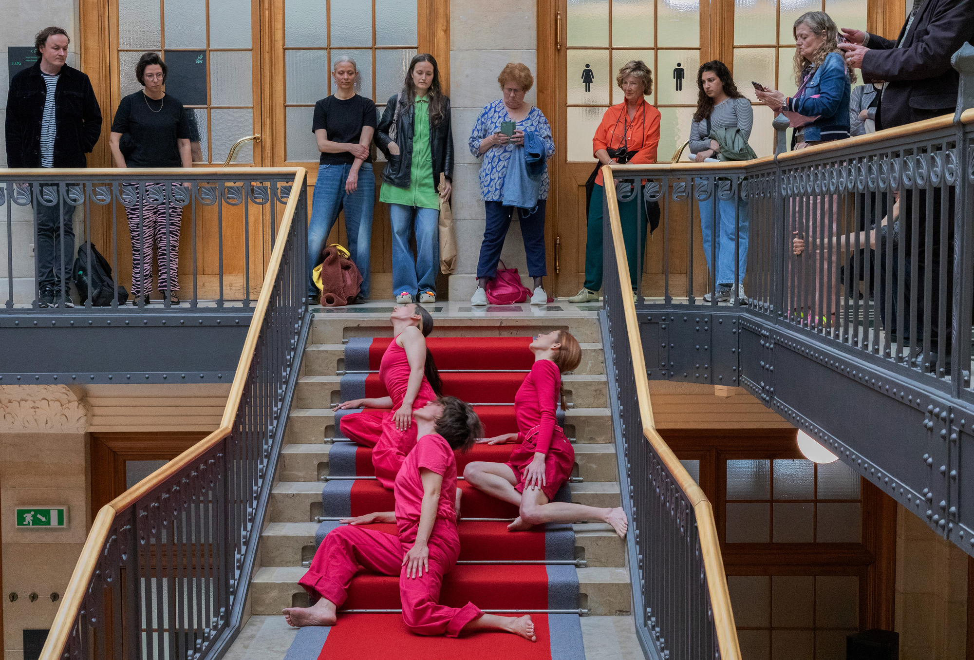 In the performance video seeping in, the movements of the textile workers merge with the entanglements of art financing and a reflection on the White Cube as an exhibition space that is only supposedly neutral. The spatial, site-specific intervention Untitled covered the walls of the White Cube with khadi cotton fabric from Islampur, Murshidabad, India. The performance The House was shown on May 24, 2025 in the otherwise inaccessible atrium of the Volkart House.