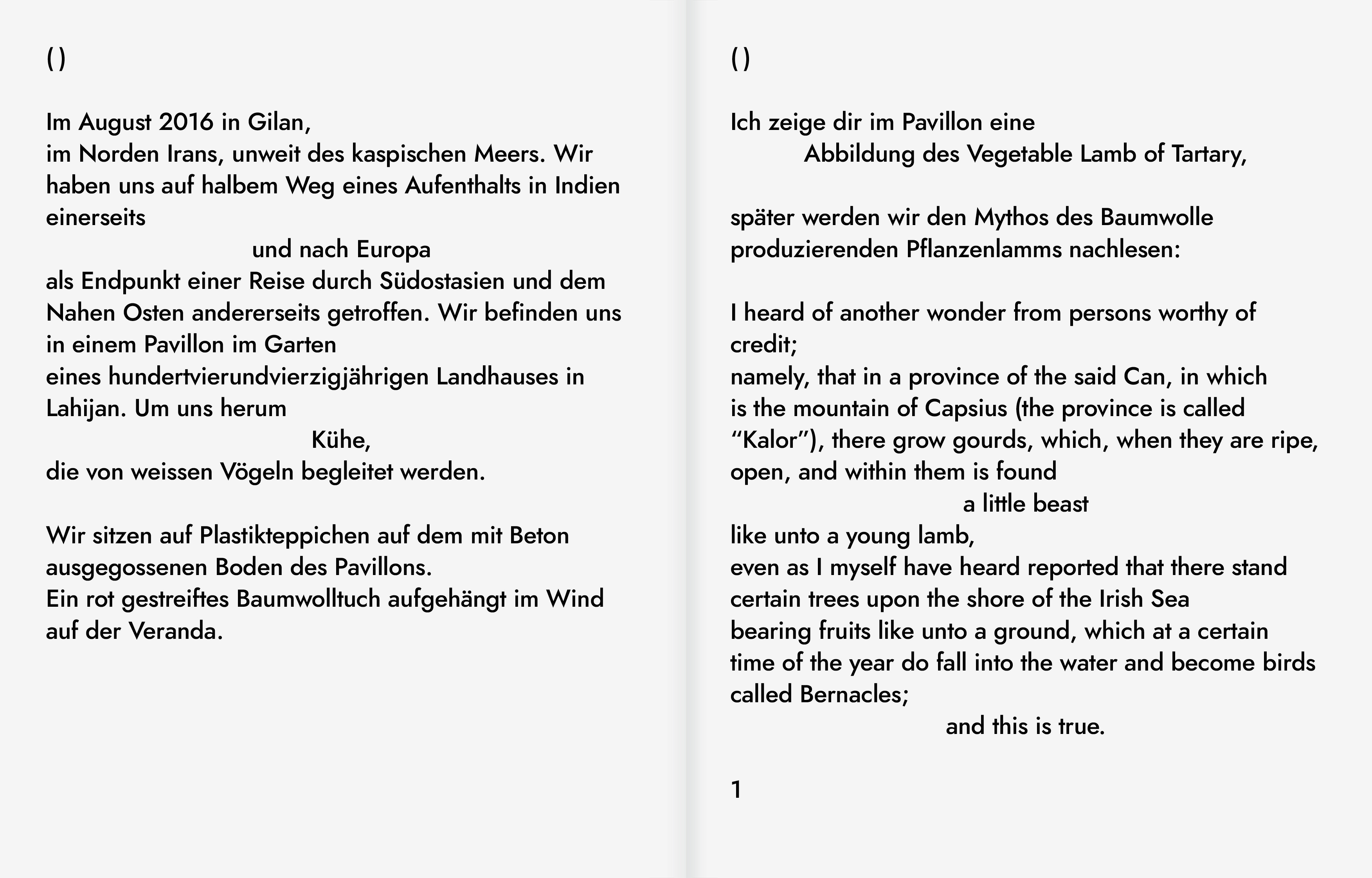 In diary-like form, the publication brings together “fragments and individual red threads from global-historical contexts of the cotton trade, spinning, weaving and planting, of synthetic materials and chemical substances, pharmaceuticals and logistics, of diverse side effects yesterday and today, of twisted physicalities, collaborative practices, and non-human agencies” (Ines Kleesattel). Stories are sewn together translocally or tell of their entanglement in global contexts: they deal with the cotton producing lamb of Tartary (originating in Northern Iran), with agricultural workers in Nagpur and weavers in Shantipur and Lodikheda, India, with a textile producer and trader with business connections to Switzerland in Jakarta, Indonesia, with disused textile factories in the Zurich Oberland, with the violent history of homework, and with the first industrial spinning machine “Spinning Jenny”.
