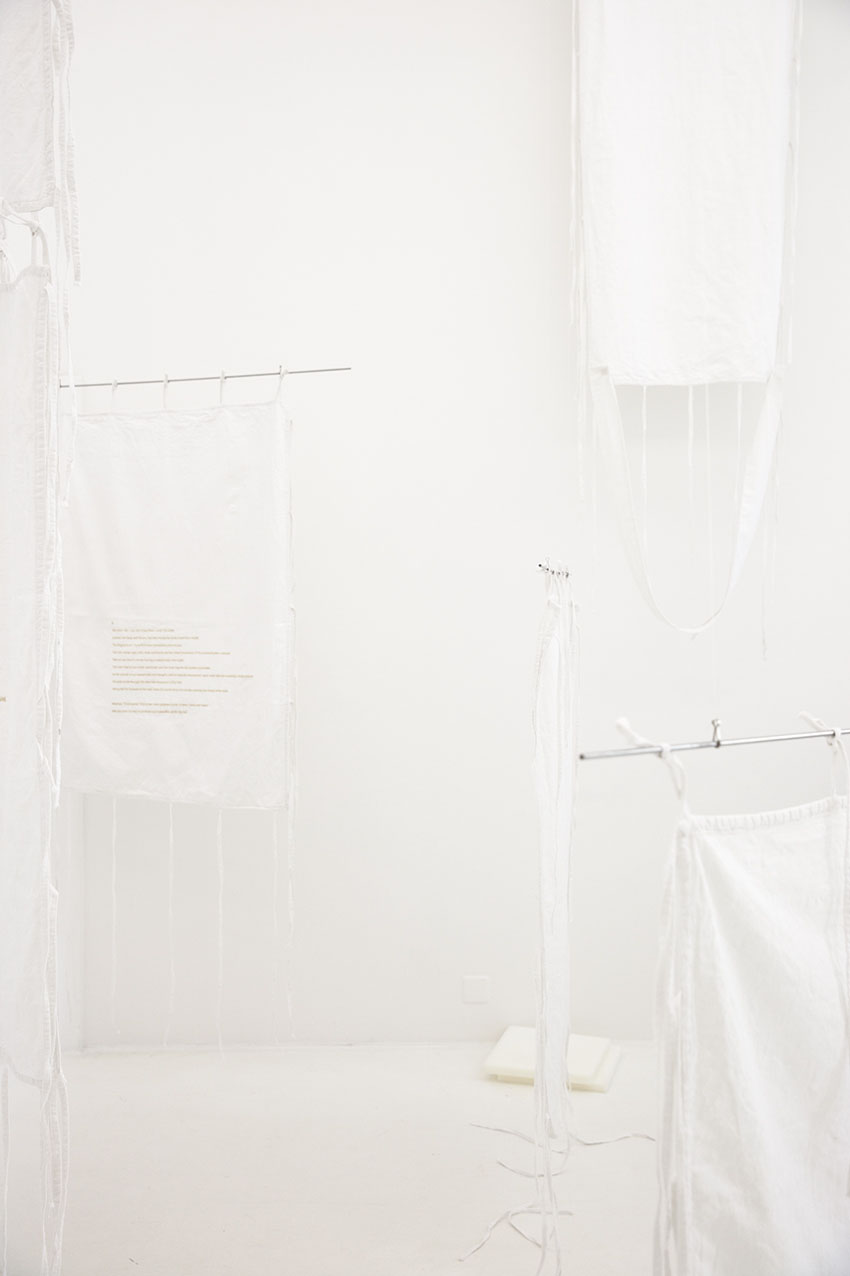 The dialogue Oh my silly, silly, silly mind! lasered onto cotton was written in English in collaboration with Samrat Banerjee. It appears in the publication Writing the body with the body – Essays, Texts and Performances (Volume B) by Stefanie Knobel.