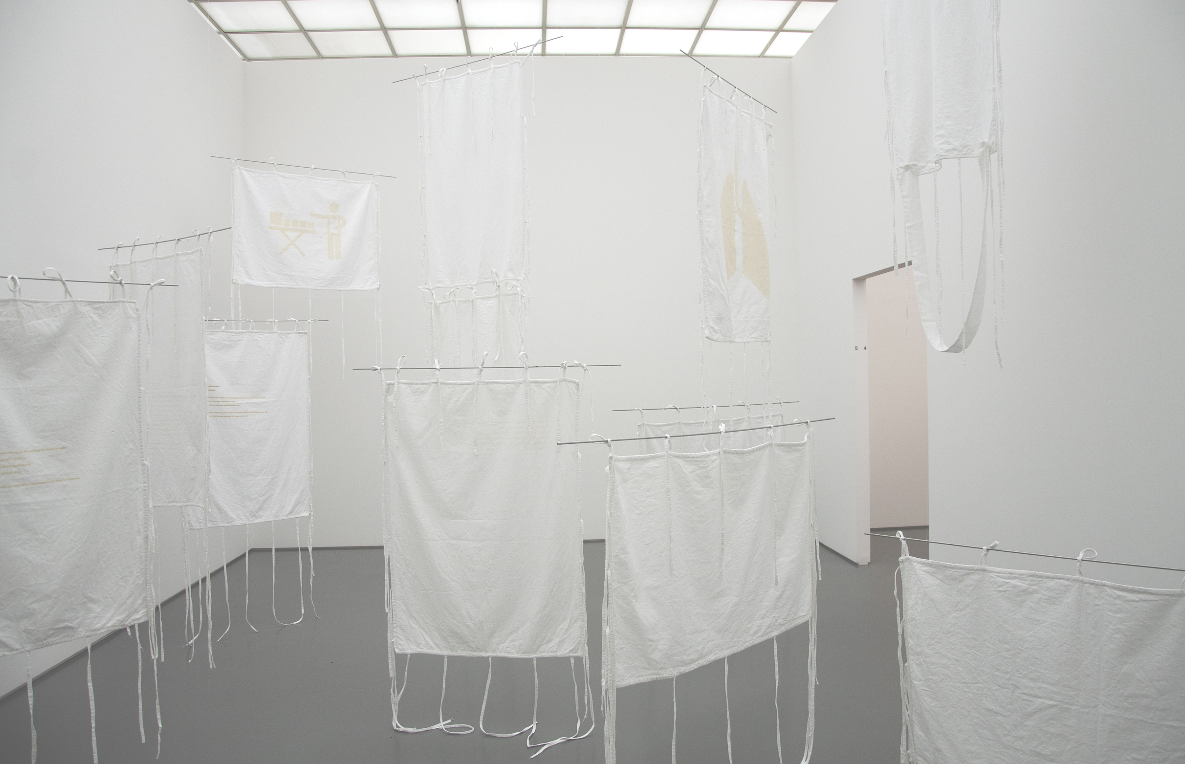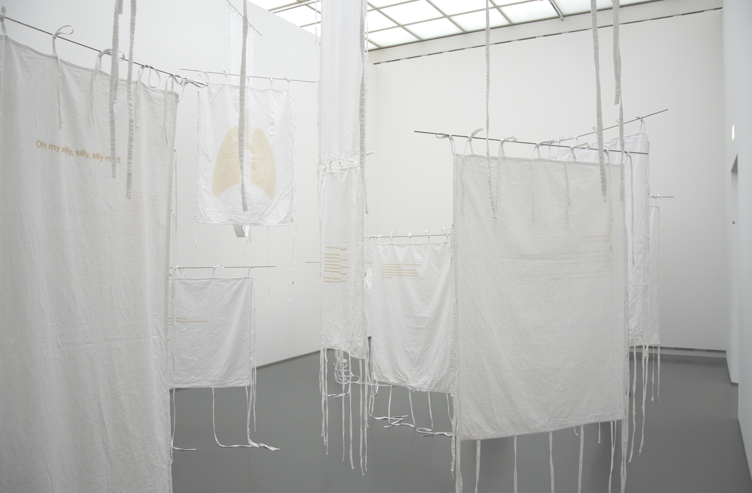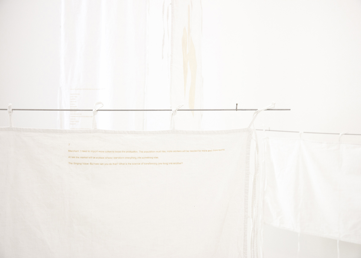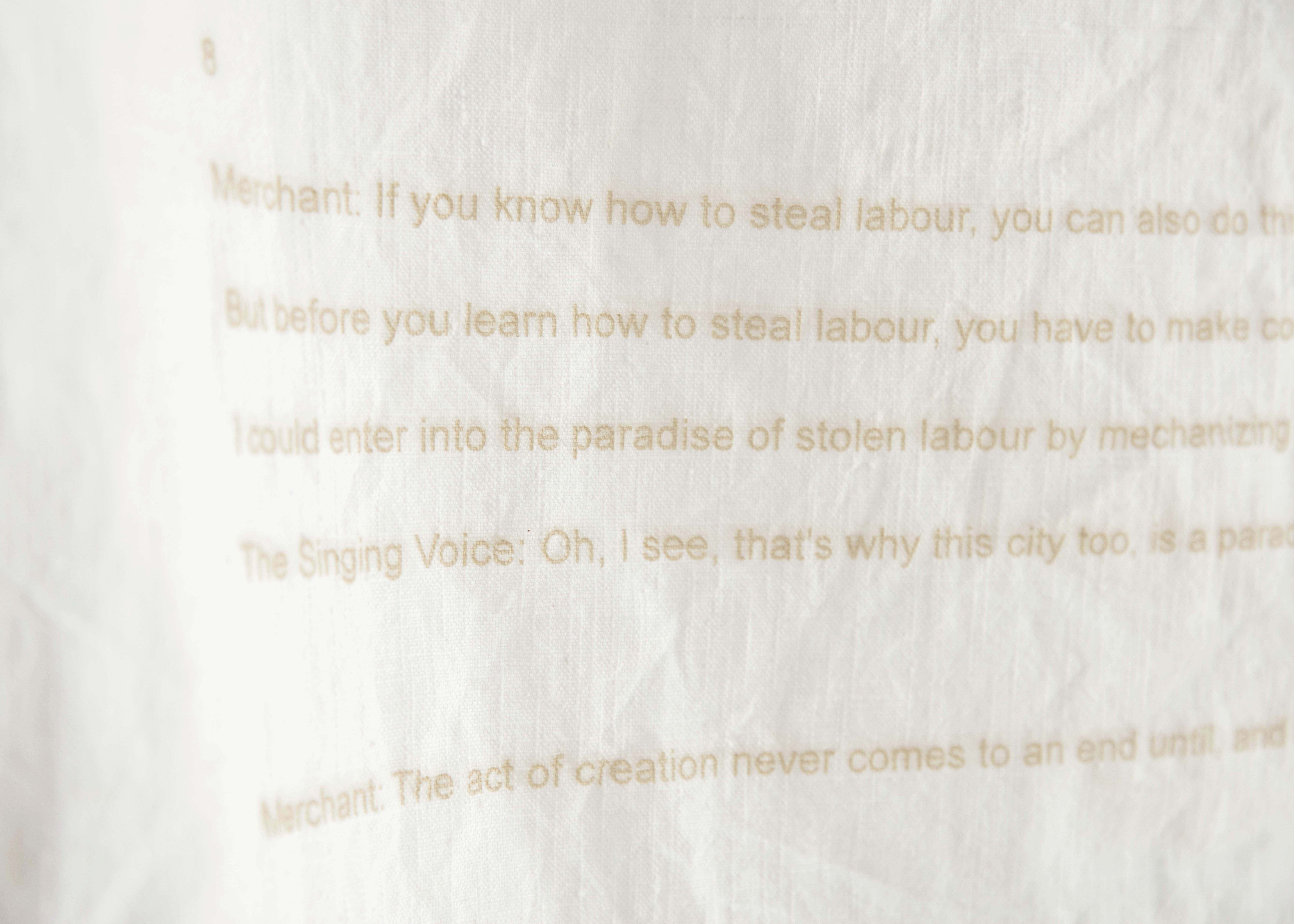 Two icons depicting a salesman and a lung are lasered onto large pieces of woven cotton. The connection between the two icons is provided by Oh my silly, silly, silly mind!, a dialogue between a singing voice and a merchant who wants to vaccinate the singing voice against all but one story. But: The vaccination doesn't work on the Singing Voice! Why not? Because she has a loom in her body. And because the Singing Voice has always collected “other stories” using the components of cotton-picking bags.