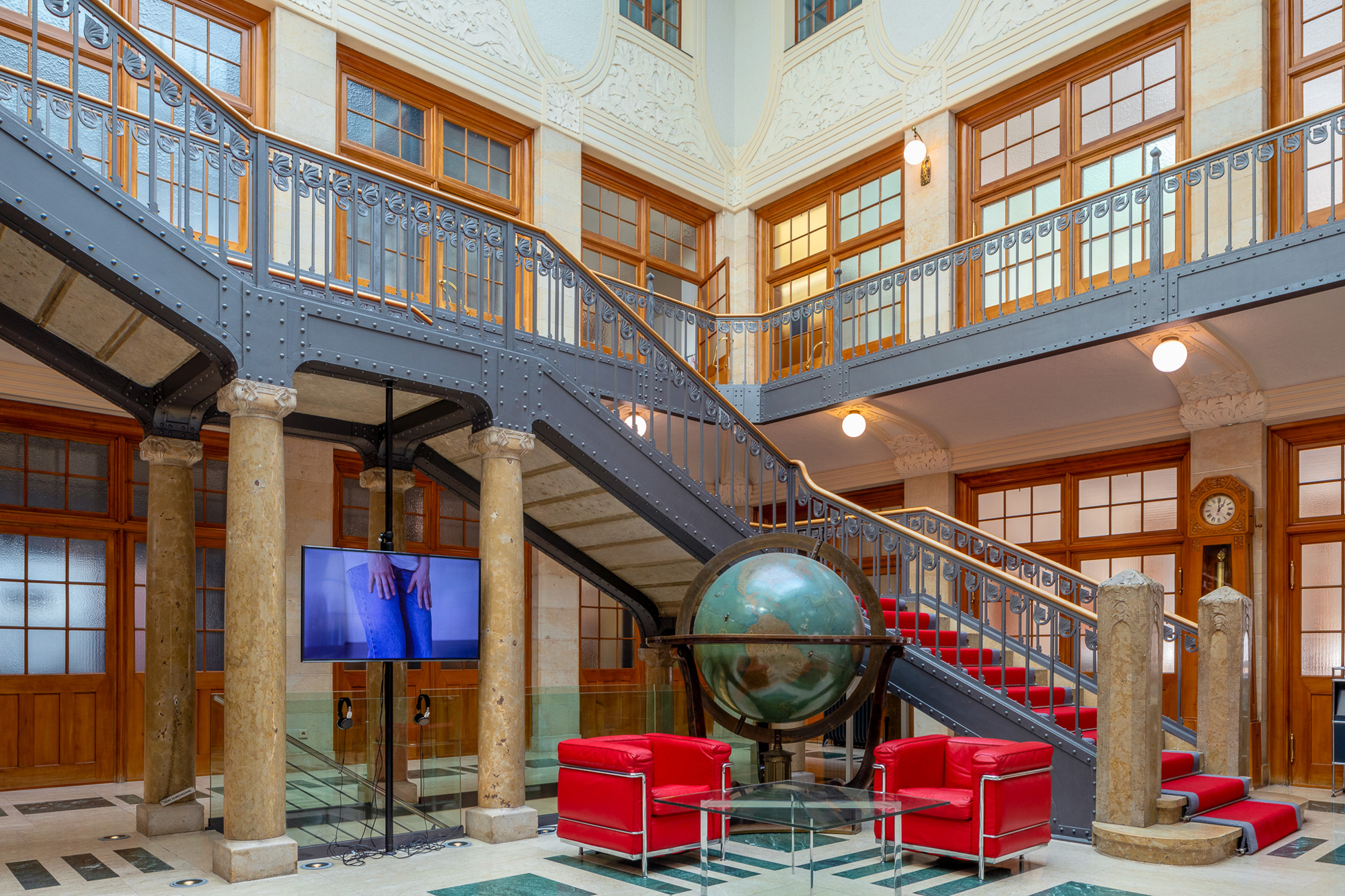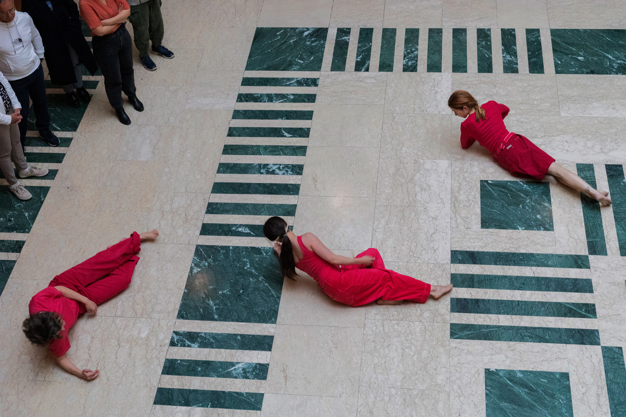 Stefanie Knobel developed a new live performance entitled The House for her exhibition On Surfaces and Structures at the Volkarthaus. She showed this on Saturday 24 May together with Charlotte Mathiessen and Nina Richard in the prestigious atrium of the Volkarthaus. The former company headquarters of the Volkart brothers, the place from which the lucrative global business with raw cotton was controlled, is confronted with gestures of resistance and rebellion. Space is taken up, conditions are reversed. Through repetitive movement sequences based on Stefanie's practice of listening with the hyoid bone and arising from her collaboration with former textile workers, more-than-human relations open up, destabilising the fixed order and addressing what is concealed. Accompanied by a sound carpet consisting of the noises of automatic spinning machines interwoven with the sounds of river dolphins, the choreographed movements formulate a silent scream, a loud absence.