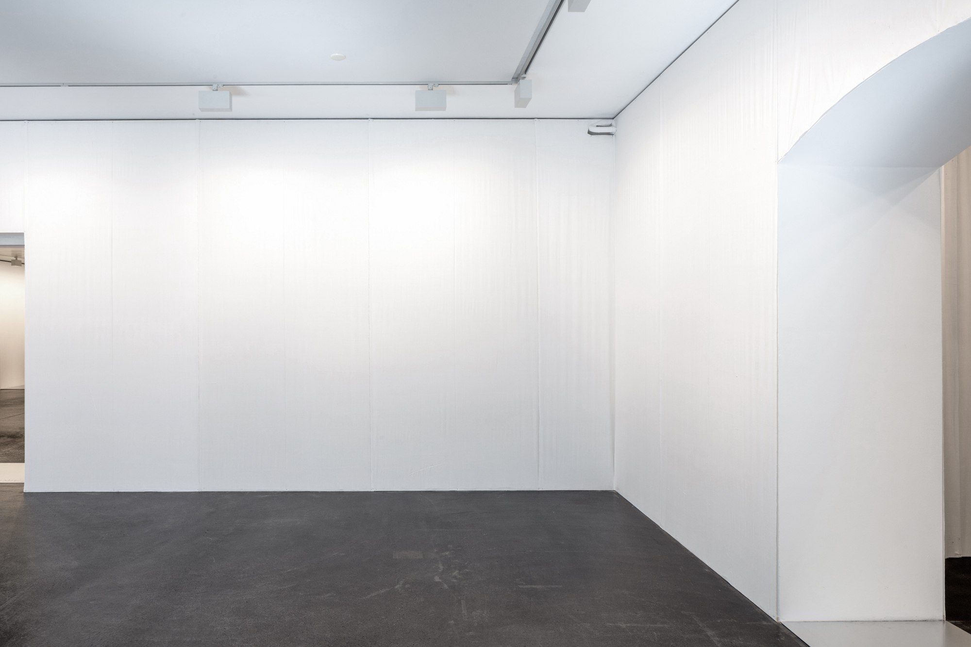 In the basement of the Volkarthaus, the artist has covered all the white walls of the exhibition space with cotton fabric. The fabric is a hand-woven, bleached khadi cotton produced by Chandrakanta Lalitmohan in Islampur, in the Murshidabad district of the Indian state of West Bengal, which the artist had shipped to Winterthur. Khadi has its historical roots in the civil disobedience movement against British colonial rule, which boycotted cheap cotton products from Great Britain and at the same time promoted local textile production, which had been destroyed under British rule. The wall covering reflects the White Cube as a supposedly neutral exhibition space.