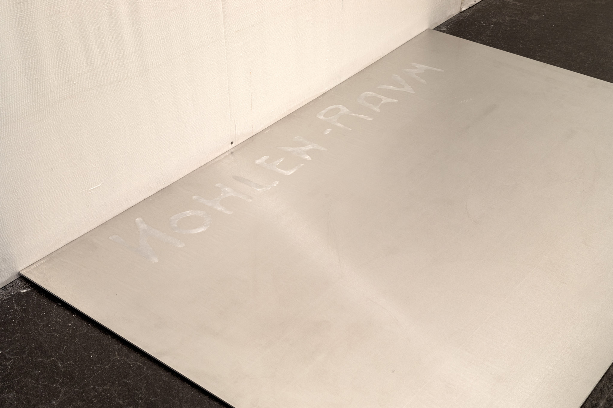 Installation view The House, aluminum plates with room designations, On Surfaces and Structures, Coalmine Winterthur. Photo: Guadaloupe Ruiz.